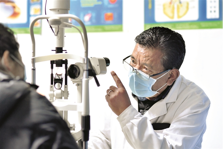 圖為3月24日,西藏拉薩光明眼科康復診療院醫(yī)生對白內(nèi)障患者進行檢查。記者 覺果 攝