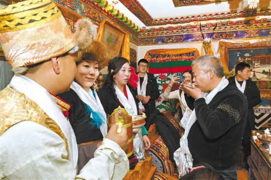 游客們在拉薩市城關(guān)區(qū)奪底街道維巴村體驗藏歷新年的別樣風俗。記者 格桑倫珠 唐斌 攝