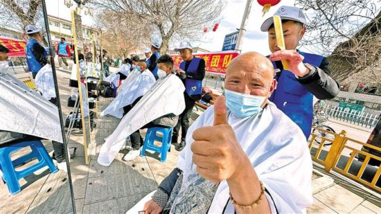 在拉薩市開展的“ 民族團結(jié)一家 巧手剪出民族情”愛心義剪志愿服務活動中,理發(fā)師們?yōu)楦髯迦罕娎戆l(fā)。記者 格桑倫珠 唐斌 攝