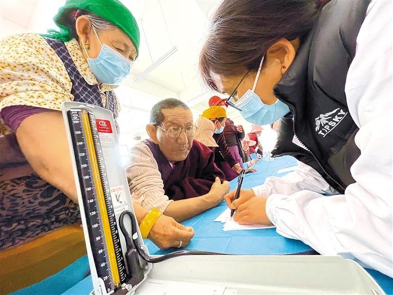 圖為義診活動(dòng)中,醫(yī)護(hù)人員為群眾測量血壓。記者 次旺 攝