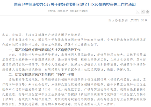 《通知》提到,各地要指導(dǎo)基層醫(yī)療衛(wèi)生機構(gòu)進一步提高思想認識,保持高度警惕,積極主動開展工作,在地方黨委政府、衛(wèi)生健康行政部門的統(tǒng)一領(lǐng)導(dǎo)下,毫不松懈做好春節(jié)期間城鄉(xiāng)社區(qū)疫情防控工作。