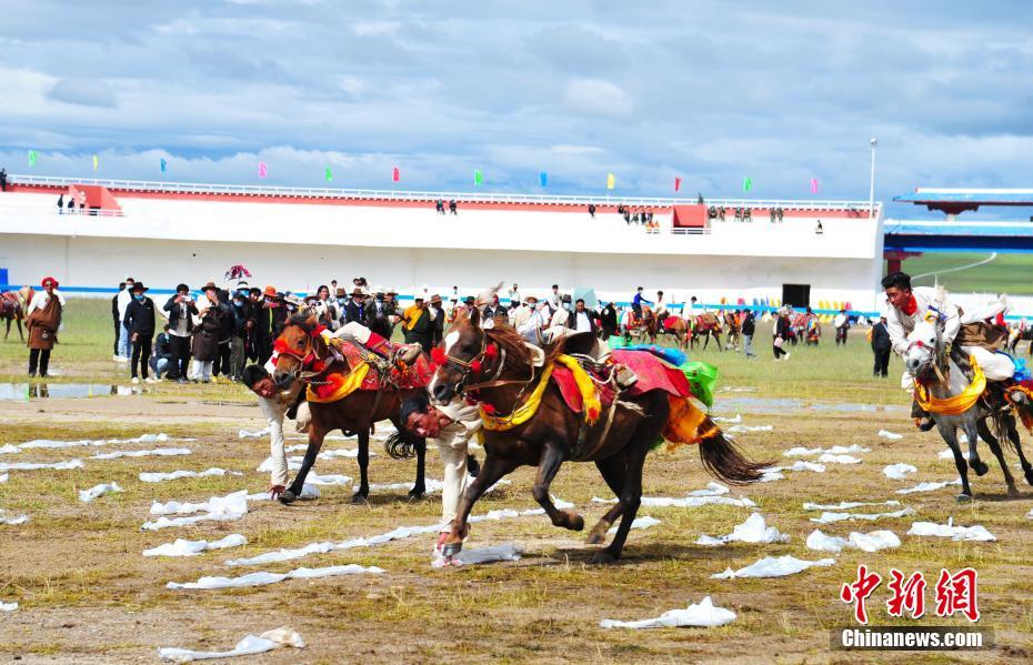 8月11日,藏北騎手表演跑馬拾哈達。8月10日,2020年那曲羌塘恰青格薩爾賽馬藝術(shù)節(jié)在西藏那曲市開幕。中新社記者 張偉 攝