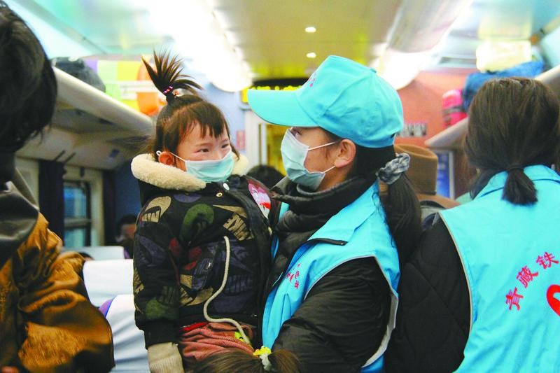 圖為拉薩火車站的志愿者在列車上為小旅客服務(wù)。