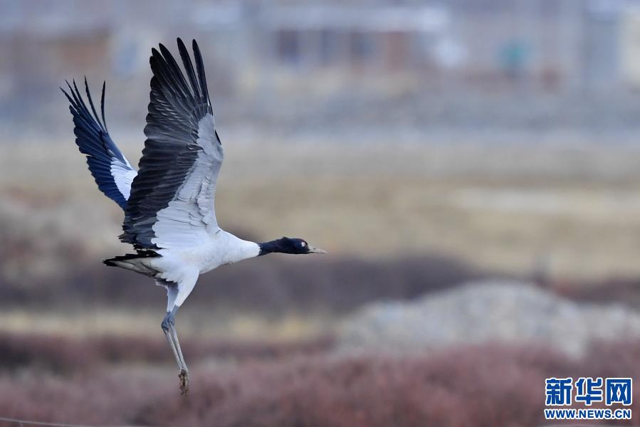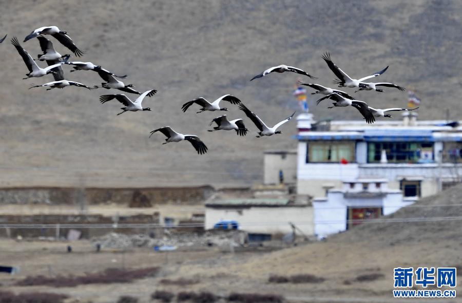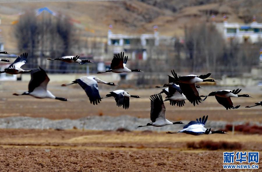 飛翔在林周縣民居前的黑頸鶴(3月14日攝)。新華社記者 張汝鋒 攝