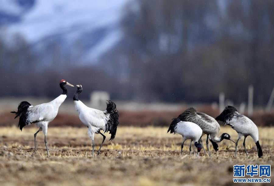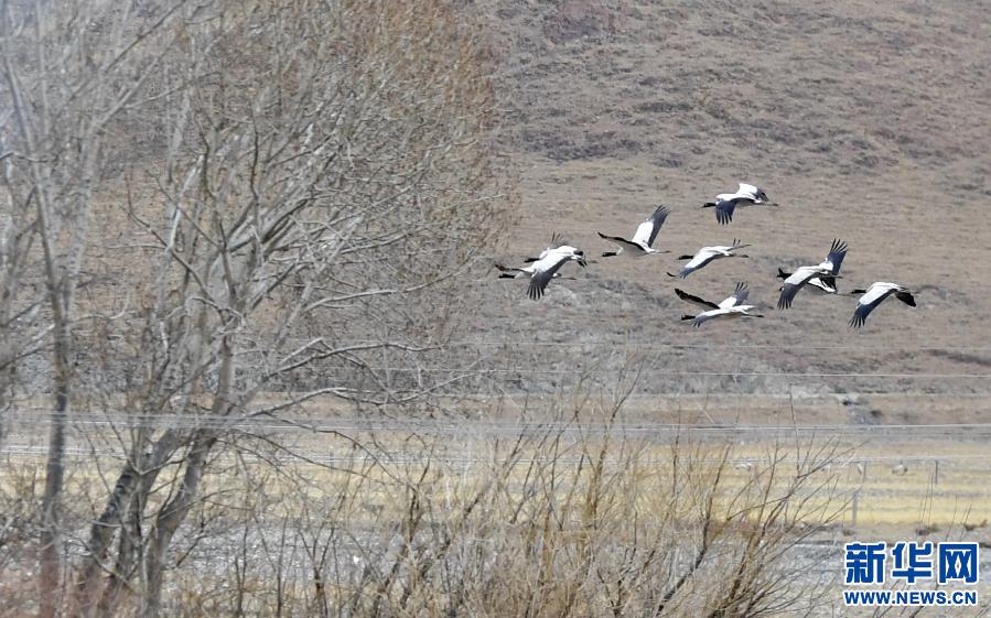 在林周縣黑頸鶴自然保護區(qū)里拍攝的黑頸鶴(3月14日攝)。新華社記者 張汝鋒 攝