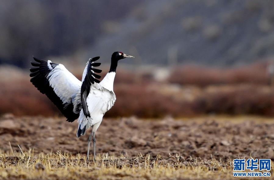 一只黑頸鶴在林周縣的農田里起舞(3月14日攝)。新華社記者 張汝鋒 攝
