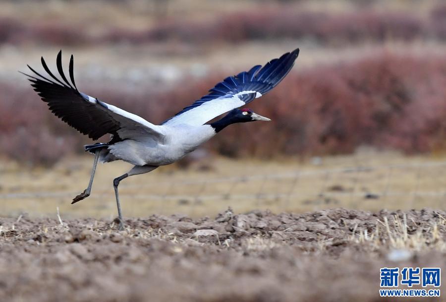 一只黑頸鶴在林周縣的農田里起飛(3月14日攝)。新華社記者 張汝鋒 攝