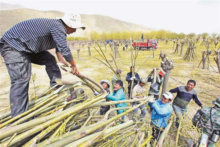 圖為拉薩市曲水縣才納鄉(xiāng)納木村村民正在整理樹苗。