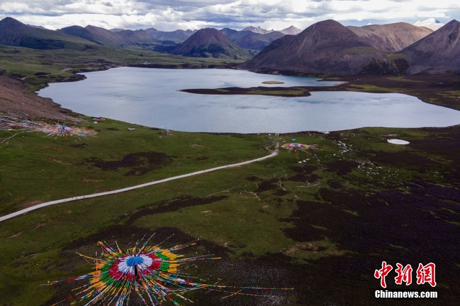 6月23日,思金拉措湖邊高原山脈風(fēng)光。思金拉措位于西藏墨竹工卡縣日多鄉(xiāng),海拔4500多米,周邊群峰簇擁,地形猶如聚寶盤,不少民眾將其稱為西藏的“財神湖”。(無人機照片) 中新社記者 江飛波 攝