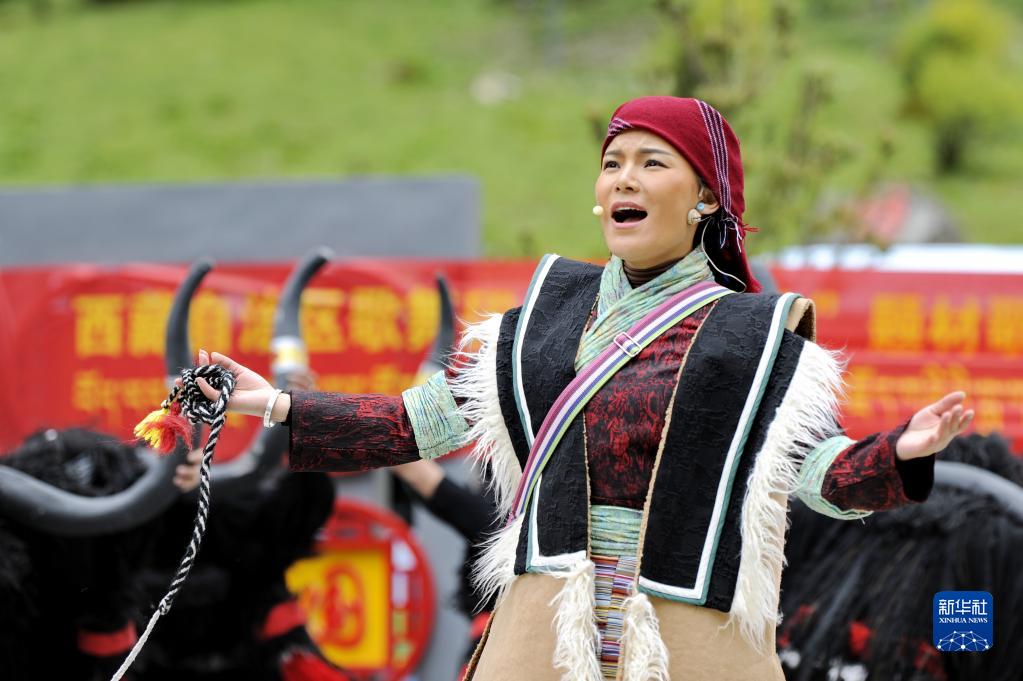 5月31日,演員在隆子縣玉麥鄉(xiāng)文化廣場(chǎng)表演歌舞劇《天邊格?;ā?。新華社記者 張汝鋒 攝