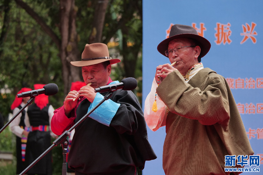 6月11日,鷹笛藝術(shù)自治區(qū)級代表性傳承人次旦和多吉在演奏《金剛山崖上的雄鷹》。新華網(wǎng) 旦增努布攝