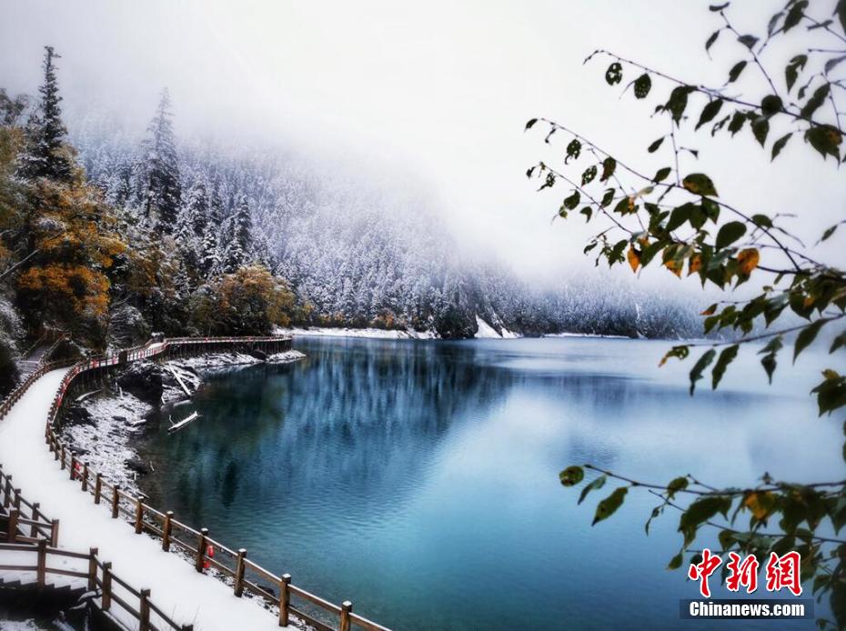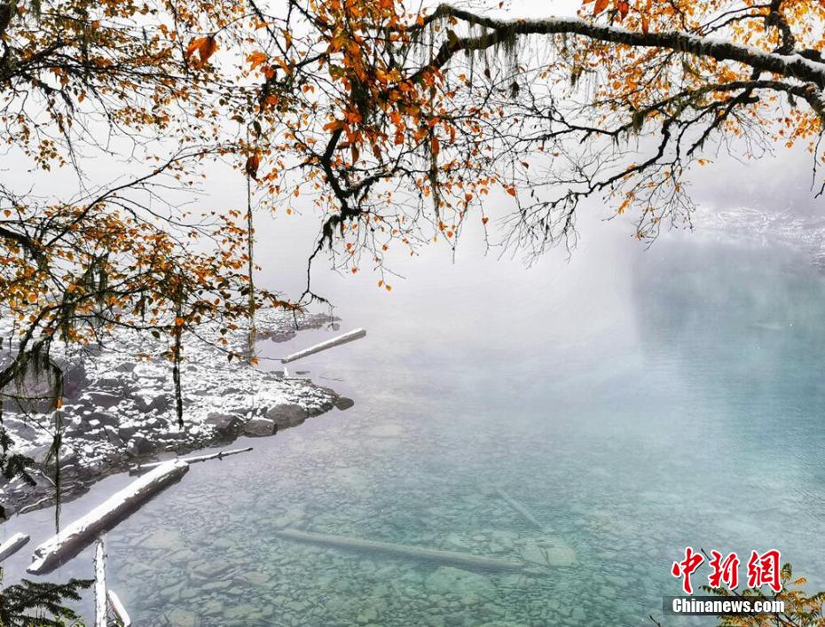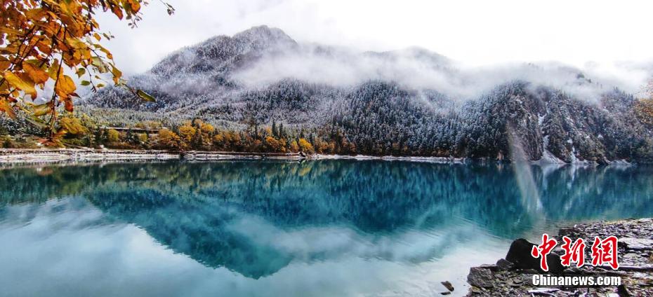 十月,九寨溝長海、原始森林等景點迎來入秋后的第一場雪。澄凈碧藍的海子和金色的彩林與潔白的雪花相映相襯,構(gòu)成一幅靜謐的美麗畫卷。遠遠看去,成片的彩林被一朵朵雪花點綴,美得像童話世界一般。 梁峰 攝