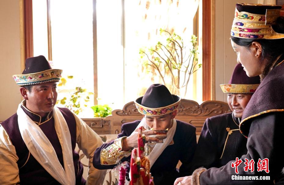 11月24日恰逢藏歷十月初一,西藏林芝迎來2023年工布新年,這是西藏最早的新年。工布新年以其悠久的歷史、鮮明的特色、豐富的內(nèi)涵,于2006年被列入第一批西藏自治區(qū)非物質(zhì)文化遺產(chǎn)保護(hù)名錄。圖為村民向客人敬酒。 阿仁 攝