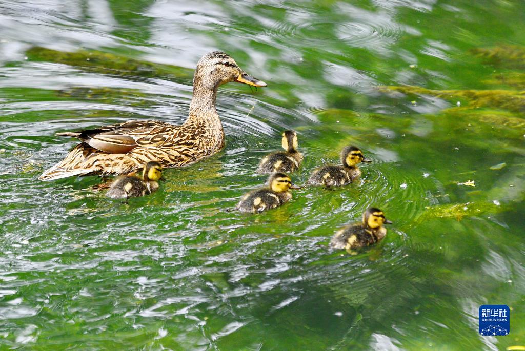 一只母綠頭鴨帶著小鴨在拉魯濕地暢游覓食(5月6日攝)。新華社記者 張汝鋒 攝