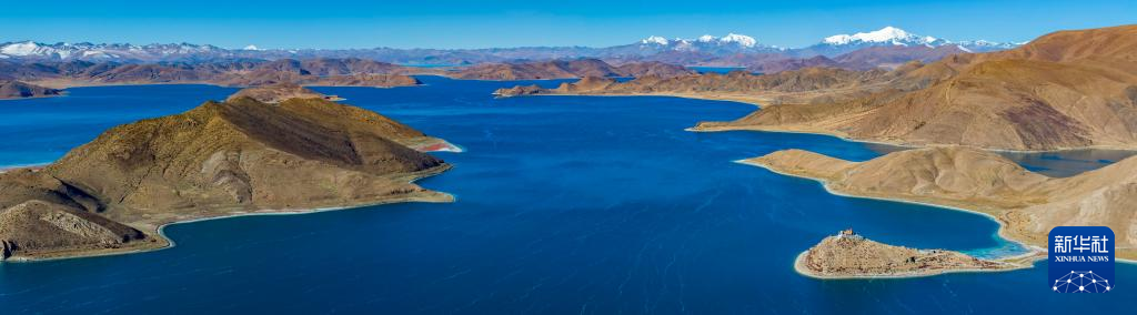 這是10月25日拍攝的羊卓雍錯(cuò)和日托寺(無人機(jī)照片)。新華社記者 姜帆 攝