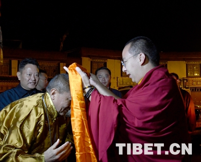 十一世班禪乘車抵達(dá)大昭寺時(shí)法號齊鳴、鼓樂喧天。早已迎候在此的中國佛協(xié)西藏分會會長珠康?土登克珠向十一世班禪敬獻(xiàn)哈達(dá),表達(dá)僧眾對他的衷心擁戴。