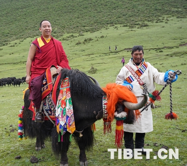陽光雨露滋潤下,夏季的牧場上到處呈現(xiàn)出翠綠欲滴、生機勃勃的景致,鮮艷的野花與成群的牦牛更是給綠草如茵的牧場鑲嵌上靚麗的花邊??疾焱暄┝炙共寄翀鰧I(yè)合作社后,十一世班禪一行來到放牧點,考察調(diào)研夏季牧場放牧點等情況。在這里,十一世班禪即興策馬徐行,展現(xiàn)出活力青春、風(fēng)華正茂的一面。