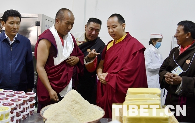 在雪林斯布牧場專業(yè)合作社考察調(diào)研過程中,十一世班禪通過參觀宣傳展板、聽取相關(guān)負責(zé)人匯報、參觀乳制品加工廠房等,詳細了解合作社的生產(chǎn)管理及運營。每到一處宣傳展板前,十一世班禪都停留片刻,仔細聆聽相關(guān)負責(zé)人的介紹,并針對一些細節(jié)問題進行詳細詢問。在參觀乳制品加工廠時,十一世班禪對車間里擺放的酥油筒產(chǎn)生了濃厚的興趣,饒有興致地手握長柄活塞,打起了酥油??吹饺橹破芳庸S里生產(chǎn)出的牦牛奶渣、酥油和酸奶,十一世班禪還品嘗了奶渣。