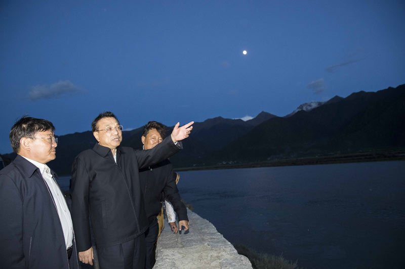 7月25日傍晚,李克強總理來到雅魯藏布江與尼洋河交匯處,考察水資源和生態(tài)保護情況。來源:中國政府網(wǎng)