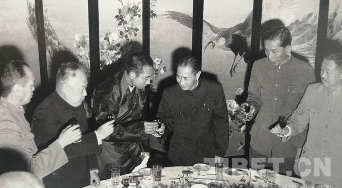 圖為1959年4月29日,中央駐藏代表張經(jīng)武在北京飯店舉行宴會(huì),慶祝西藏自治區(qū)籌備委員會(huì)成立三周年。右起:賀龍、阿沛?阿旺晉美、張經(jīng)武、十世班禪、陳毅、烏蘭夫。