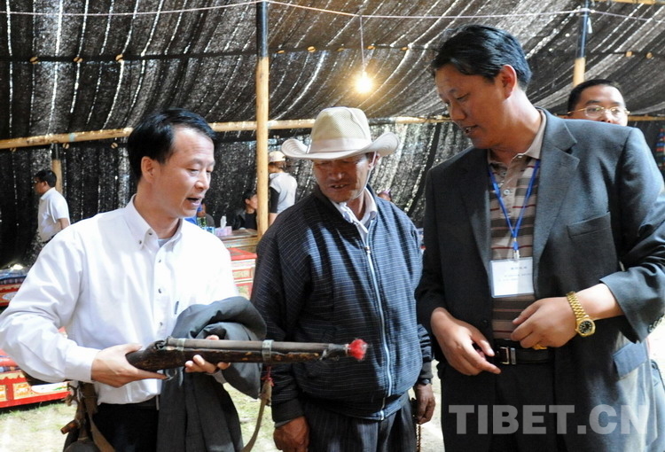 這是時任那曲縣縣長扎南(右)與中石化首批援藏干部李一超(左)在那曲賽馬會的大“黑賬”里,正在交流牧民傳統火槍的使用方法(唐召明2009年8月12日攝)
