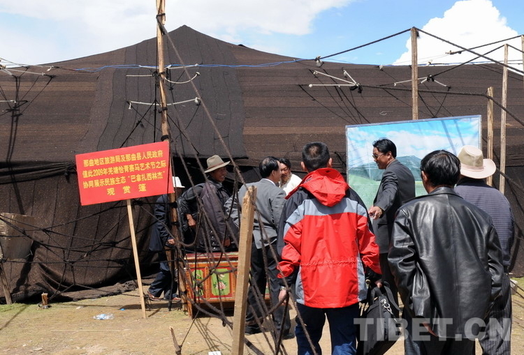 這是人們在排隊參觀那曲賽馬會所展示的巨大黑色牦牛毛帳篷。這頂大“黑帳”占地面積3600平方米、內部有效面積666平方米,可供上百人自由活動(唐召明2009年8月12日攝)