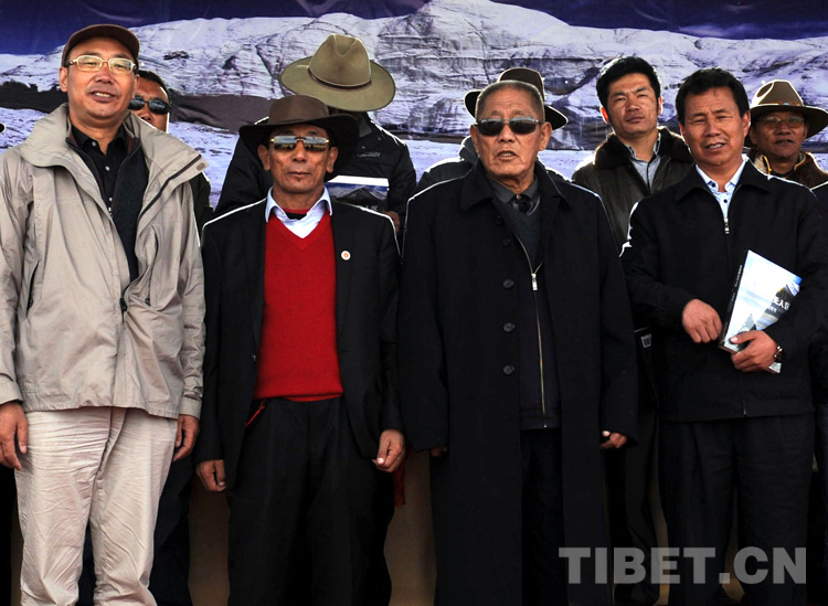 這是唐召明(左一)與雙湖縣縣委書記南培(右一)等領導在贈書儀式結束后合影留念。當日,唐召明所著的《走遍藏北無人區(qū)》一書在雙湖縣舉行了首發(fā)和贈書儀式(唐召明提供,2013年7月27日攝)