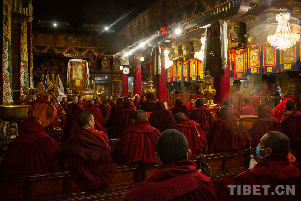 圖為十一世班禪在釋迦牟尼佛像前帶領(lǐng)眾僧念誦經(jīng)文 攝影:鄭朔