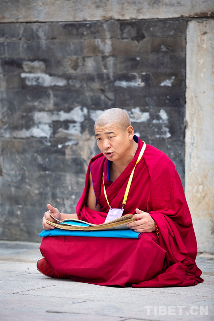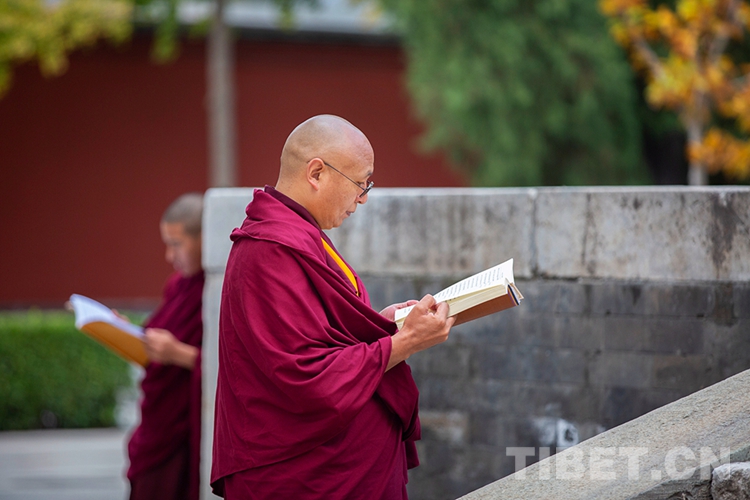 中國西藏網(wǎng)訊 10月29日,深秋的清晨,位于北京西黃寺的中國藏語系高級佛學(xué)院內(nèi),古柏蒼蒼,清凈肅穆。還有半個小時,2020年藏傳佛教第十六屆“拓然巴”高級學(xué)銜畢業(yè)考試辯經(jīng)考試就將準(zhǔn)時開始。等待參加辯經(jīng)考試的學(xué)僧們,正在西黃寺大殿前誦經(jīng),抓緊時間為考試進行最后的準(zhǔn)備。大家或席地而坐,或立定一隅,或踱步前行,梵唱聲聲,余音繞梁。(中國西藏網(wǎng) 攝影/許娜 編輯/周晶)