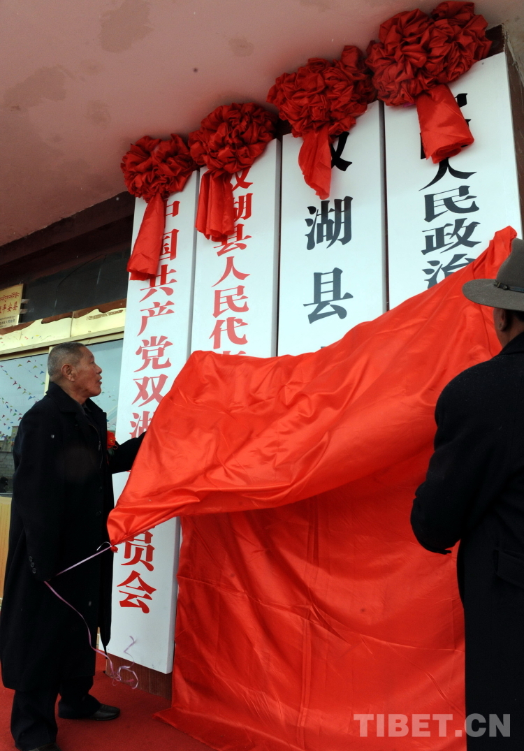 這是洛桑丹珍(左)在為雙湖設縣掛牌(唐召明2013年7月26日攝)