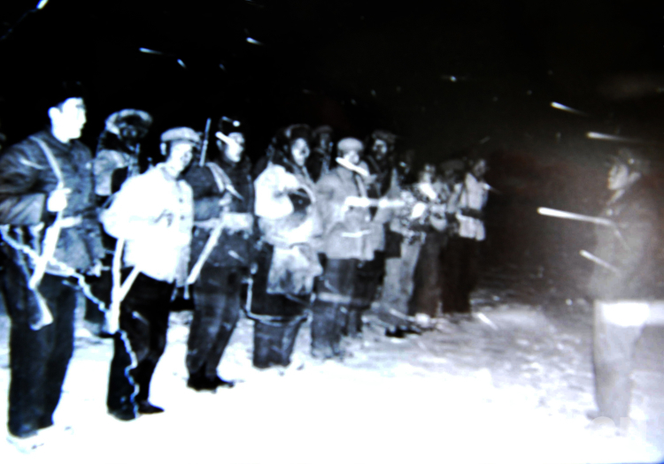 洛桑丹珍(右)等18勇士既是干部,又是民兵。這是他們清晨在冒雪訓練(唐召明提供,1976年攝)