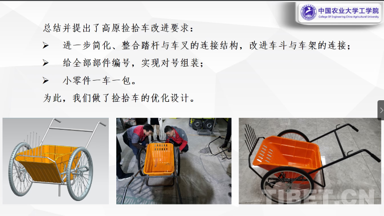 啟動(dòng)會(huì)上,高原撿拾車研發(fā)首席專家中國(guó)農(nóng)業(yè)大學(xué)工學(xué)院教授王光輝介紹了高原撿拾車最新改版的情況。他表示,針對(duì)過(guò)去推廣中發(fā)現(xiàn)的個(gè)別問(wèn)題,對(duì)車子進(jìn)行了優(yōu)化設(shè)計(jì),去掉了易發(fā)生損壞的控叉線閘,調(diào)整了車身的踏桿與車叉的連接結(jié)構(gòu),改進(jìn)車斗與車架的連接,做到了對(duì)號(hào)組裝和小零件一車一包等,使安裝更加便捷、使用更加方便、車子更加堅(jiān)固。
