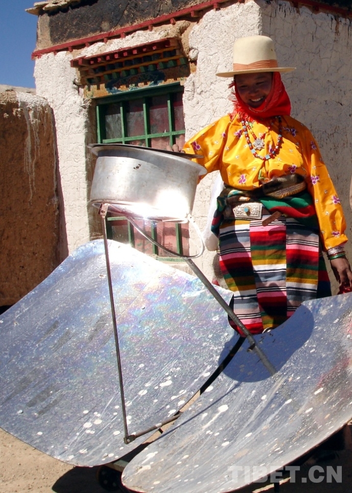在藏北高原,現(xiàn)在隨處可見(jiàn)城鎮(zhèn)里的一個(gè)個(gè)太陽(yáng)能路燈、一棟棟太陽(yáng)能采暖樓和采暖房,一排排房頂上斜立著的太陽(yáng)能熱水器,就連牧民家也常??梢钥吹桨卜旁诖扒啊⑽蓓敽驮簝?nèi)的電池板、太陽(yáng)灶。利用太陽(yáng)能燒水做飯和發(fā)電照明,既方便又干凈,老天爺還不收燃料費(fèi)。