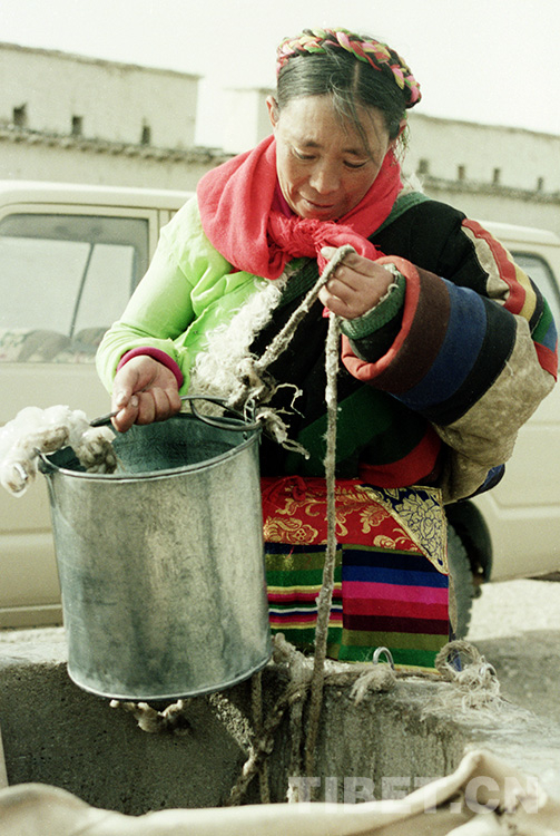 圖為文部辦事處申亞鄉(xiāng)女鄉(xiāng)長卓瑪在打井水。她當時是全國“三八”紅旗手、那曲地區(qū)唯一的女鄉(xiāng)長(唐召明1989年12月攝)