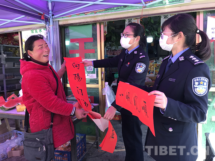2月7日,拉薩邊檢站邀請拉薩市文聯(lián)書法家協(xié)會共同開展“同心同書——祖國新春好”送萬福進(jìn)萬家活動(dòng)。4名書法家揮毫潑墨,書寫漢文藏文春聯(lián),散發(fā)著墨香的春聯(lián)凝聚著無限的祝福。隨后,邊檢站格?;ㄅ訄?zhí)勤隊(duì)民警為駐地商戶送“?!彼痛郝?lián)。在駐地的一家超市,商戶張大姐興高采烈地與民警一邊貼春聯(lián),一邊笑著說:“感謝你們送來的新春祝福。今年雖然沒能回家過年,但有你們的陪伴照顧,我們感到很開心。”