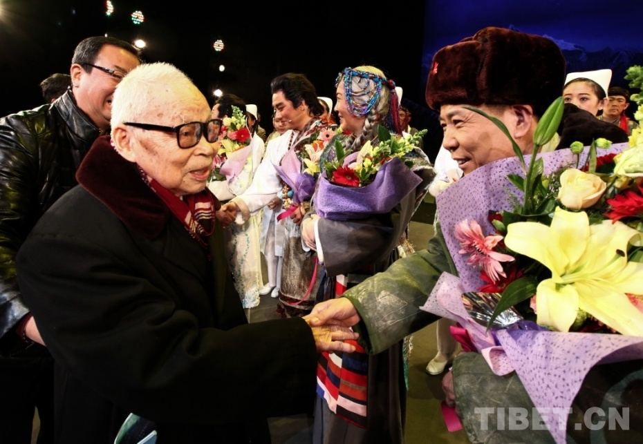 圖為北京建藏援藏工作者協(xié)會學習指導老師陰法唐將軍在中國評劇院所創(chuàng)作的評劇《藏地彩虹》試演結(jié)束后,上臺握手祝賀(唐召明2017年12月10日攝)