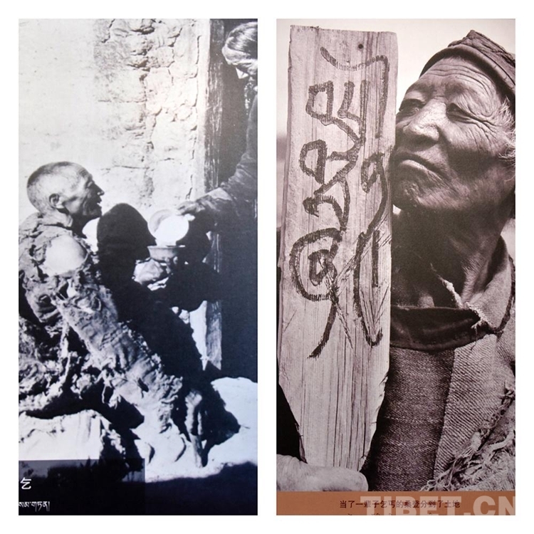 中國(guó)西藏網(wǎng)訊 一張圖片是衣服破爛的桑登手拿木碗正在求乞,一張圖片是桑登分到了土地,短短幾年,曾是乞丐的桑登生活發(fā)生了巨大的變化,這一切是因?yàn)?959年的西藏民主改革。