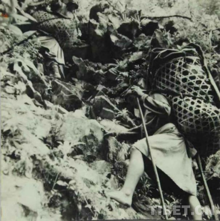 舊西藏,墨脫群眾赤腳徒步爬山背運(yùn)物資的情景
