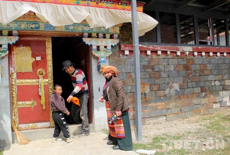圖為次卓瑪與女婿拉巴多吉正在家門(mén)口招呼剛剛放學(xué)的小外孫回家吃飯 攝影:劉莉