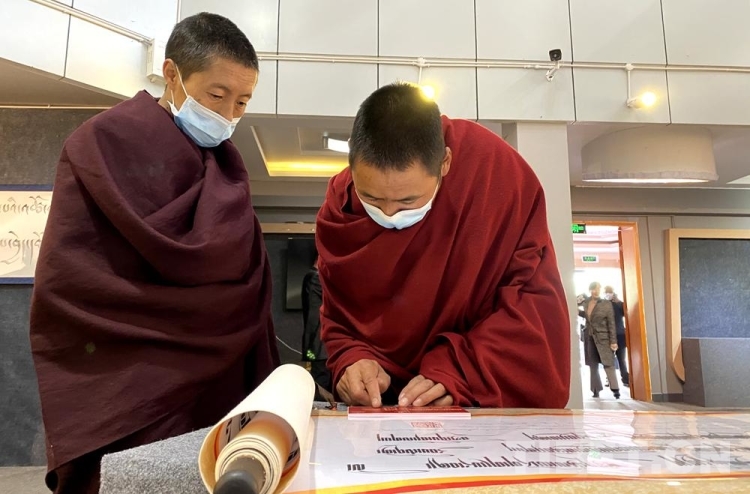 圖為2021年5月,“同心共筑中國夢”——西藏僧尼群眾書法精品展現(xiàn)場,僧尼正在觀看展現(xiàn)了烏金體、朱匝體等20余種風格迥異的藏文書法體系的書法作品《藏文字體大全》 攝影:王媛媛