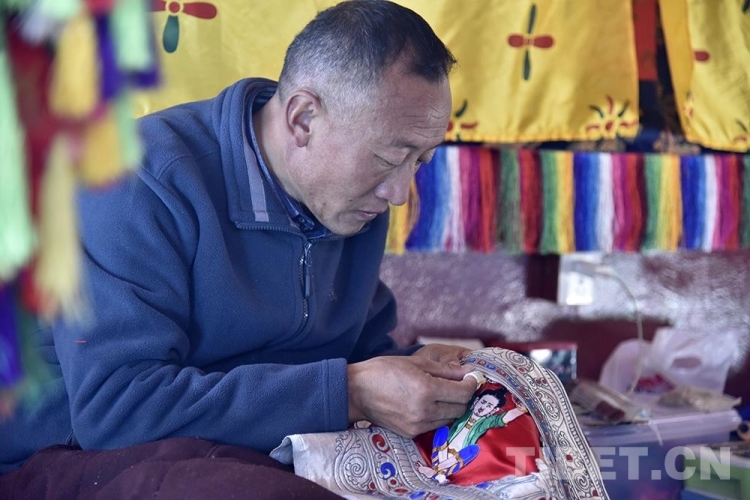 圖為2021年4月拍攝的西藏自治區(qū)非物質(zhì)文化遺產(chǎn)項目拉薩堆繡唐卡代表性傳承人羅布正在制作堆繡唐卡 攝影:王媛媛