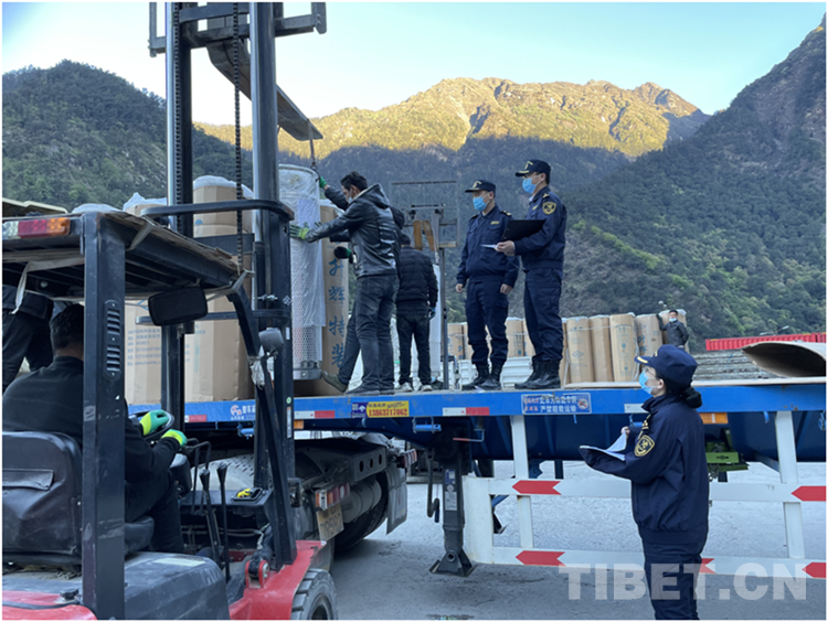 圖為聶拉木海關關員正在對援尼物資進行現(xiàn)場監(jiān)管