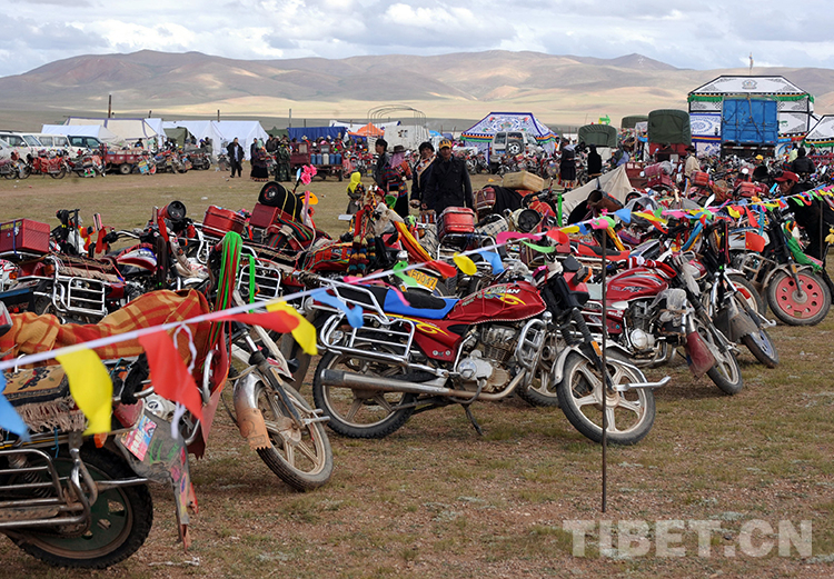 這是在雙湖“撤區(qū)建縣”慶?;顒?dòng)上,許多牧民騎著自家摩托車(chē)遠(yuǎn)道而來(lái)(唐召明2013年7月26日攝)