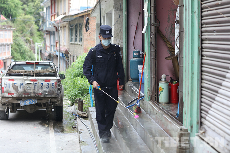 圖為邊檢站民警為駐地工人生活區(qū)消毒 攝影:鄒興國