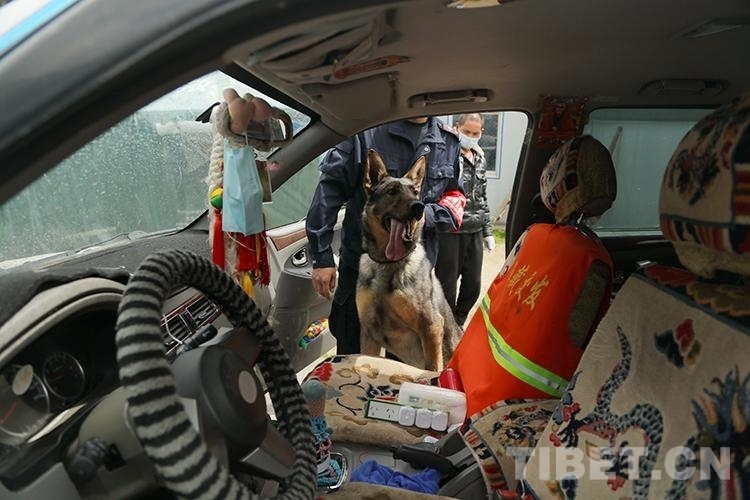 圖為西藏亞?wèn)|出入境邊防檢查站警犬“黑崽”查控車輛 攝影:李錦輝