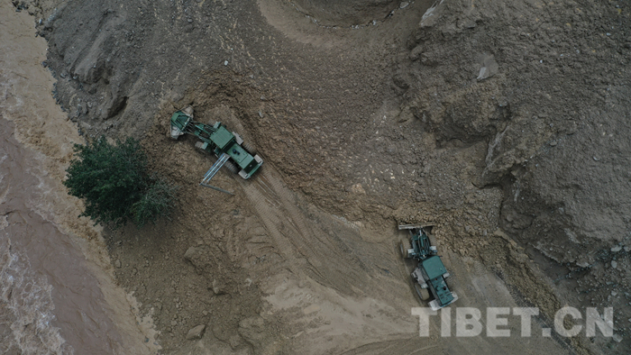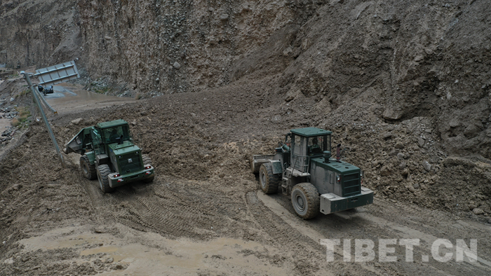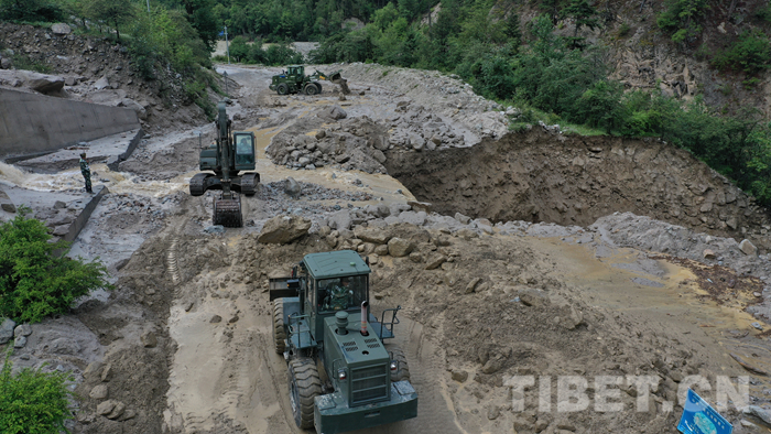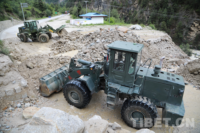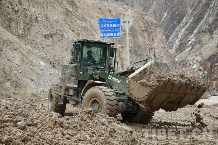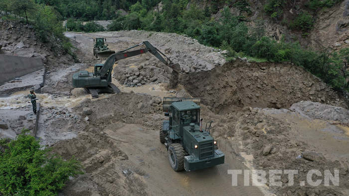 圖為該支隊救援官兵正在對川藏線玉普鄉(xiāng)境內(nèi)泥石流進行清理