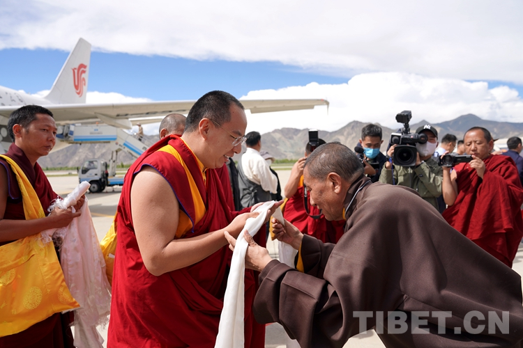 西藏自治區(qū)黨委常委、統(tǒng)戰(zhàn)部部長(zhǎng),區(qū)政協(xié)黨組副書記、副主席旦科等西藏自治區(qū)相關(guān)領(lǐng)導(dǎo)在貢嘎機(jī)場(chǎng)迎接,互敬哈達(dá)。