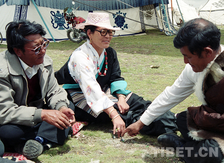 1987年盛夏,時任那曲地區(qū)(現(xiàn)那曲市)行署副專員的次仁玉珍(中)在那曲賽馬會的帳篷前,席地而坐與那曲地區(qū)行署專員土登才旺(左)、那曲地區(qū)文化局局長阿布(右)在交流(唐召明1987年攝)