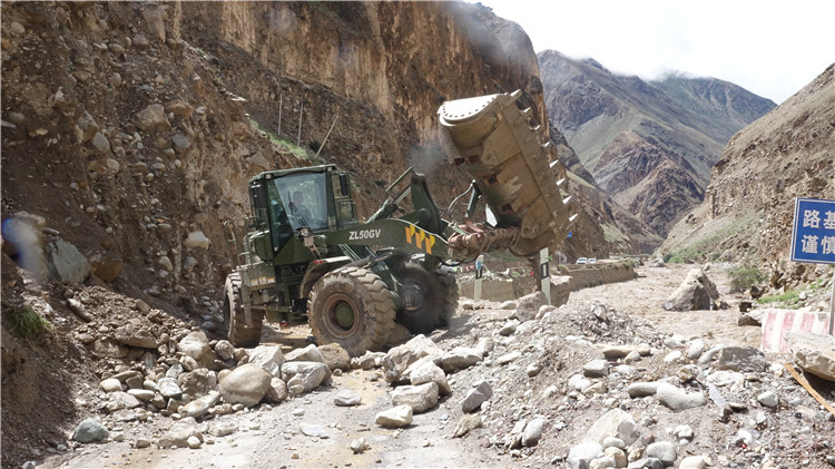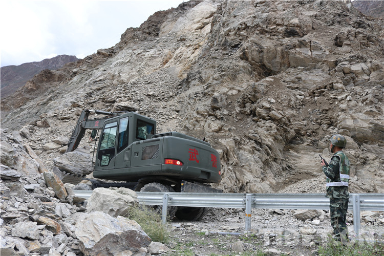 抵達(dá)現(xiàn)場(chǎng)后,武警官兵及時(shí)對(duì)災(zāi)害路段實(shí)施交通管制,并把滯留車輛疏導(dǎo)至安全區(qū)域,隨即對(duì)泥石流堆積物和塌方體進(jìn)行清理。因?yàn)?zāi)害點(diǎn)處于峽谷地帶,地勢(shì)十分險(xiǎn)要,作業(yè)面狹窄,且降雨及落石持續(xù)不斷,為確保搶通工作高效安全,指揮員科學(xué)指揮,安全員高度警惕,操作手快速搶通,各要素密切配合,給道路搶通工作爭(zhēng)取了寶貴時(shí)間。