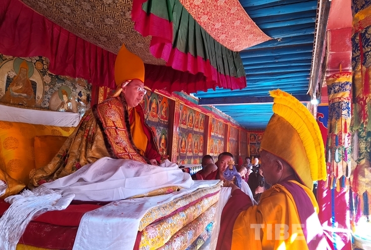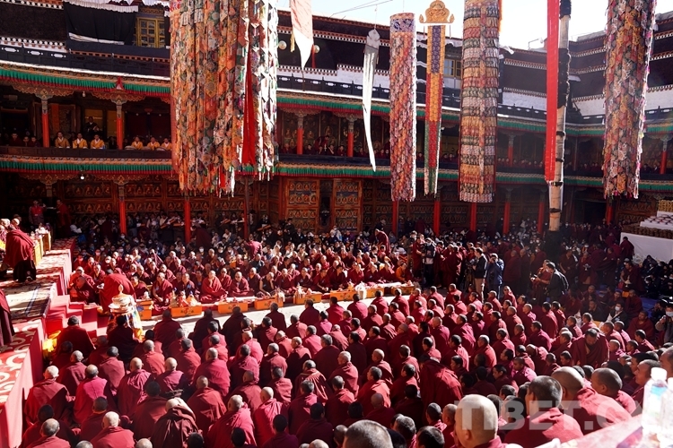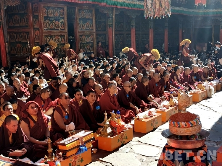 上午10時(shí),隨著法號(hào)響起,領(lǐng)經(jīng)師領(lǐng)經(jīng)下僧眾開(kāi)始集體誦經(jīng),班禪由手持香爐和吹嗩吶僧人引路來(lái)到扎什倫布寺多加大院。慶祝儀式上,扎什倫布寺高僧活佛、各寺廟僧尼代表及班禪親屬依次敬獻(xiàn)曼扎、禮品。同時(shí),扎什倫布寺僧人在會(huì)場(chǎng)上以辯經(jīng)、跳“卡爾”舞等方式祝賀,并向現(xiàn)場(chǎng)信教群眾發(fā)放酥油茶、人參果、八寶飯等,共沾法喜。場(chǎng)面恢宏,恭敬威儀。